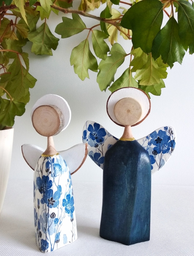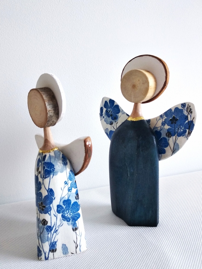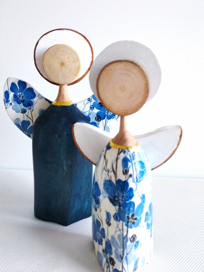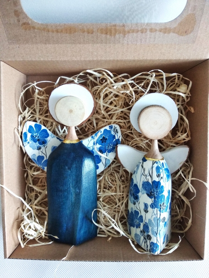 Aniołki wykonane z drewna bukowego. Aniołek w sukience w kwiatki i skrzydła drugiego aniołka zdobione są metodą decupage. Sukienka niebieskiego aniołka barwiona jest bejcą wodną i zabezpieczone bezbarwnym akrylowym lakierem. Zestaw ten to idealny prezent dla babci i dziadka ,a także dla miłośników aniołów i rękodzieła. Wysokość aniołków: 16 cm i 14,5 cm.