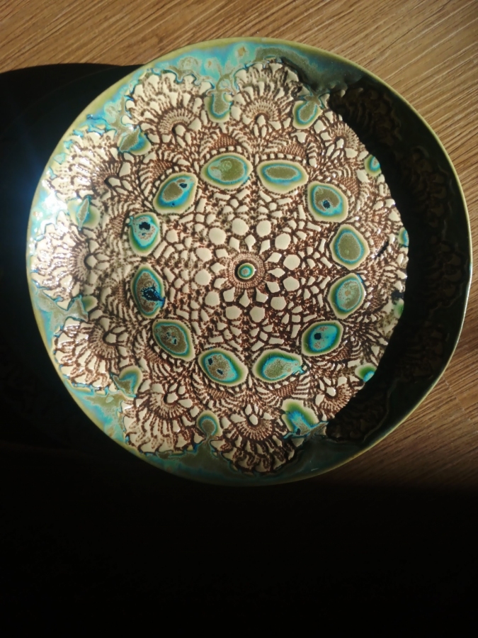 Niewielka patera ceramiczna, lepiona ręcznie z płata, zdobiona motywem ręcznie dzierganej koronki. Patera pokryta jest szkliwem w odcieniach zieleni, miejscami przechodzącej w turkusy i stare złoto, część pokryta jedynie szkliwem transparentnym podkreślającym wzór koronki. Patera będzie pięknie prezentować się w minimalistycznych współczesnych przestrzeniach, wnosząc w nie nieco koloru i ciepła, jak również w przestrzeniach w stylu boho i rustykalnym. Paterę można używać do serwowania żywności, np. ciast, ciasteczek, pieczywa. Można ją również myć w zmywarce (w krótkich cyklach), natomiast zalecane jest mycie ręczne.