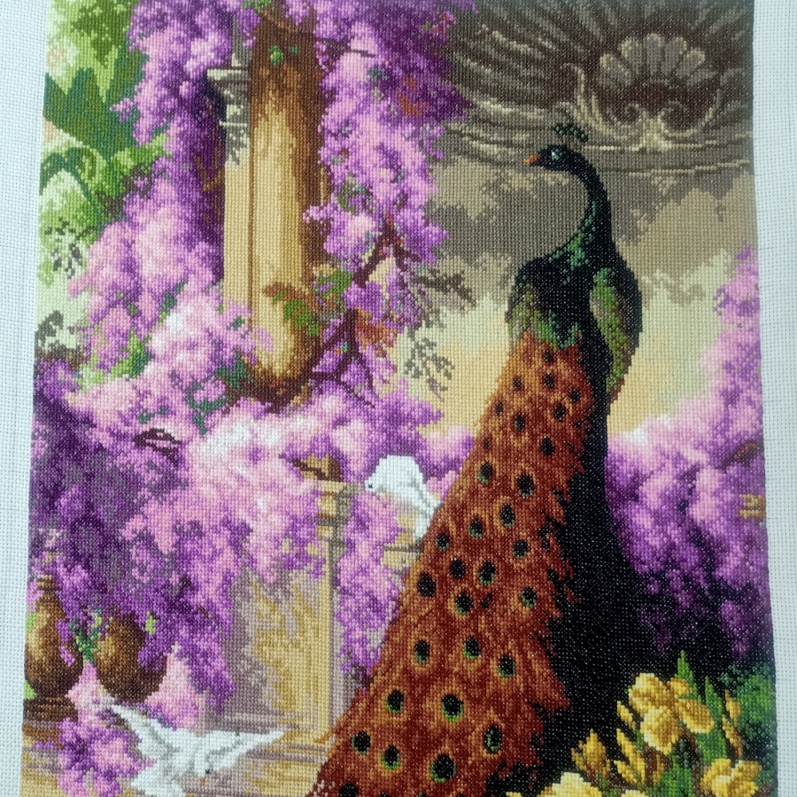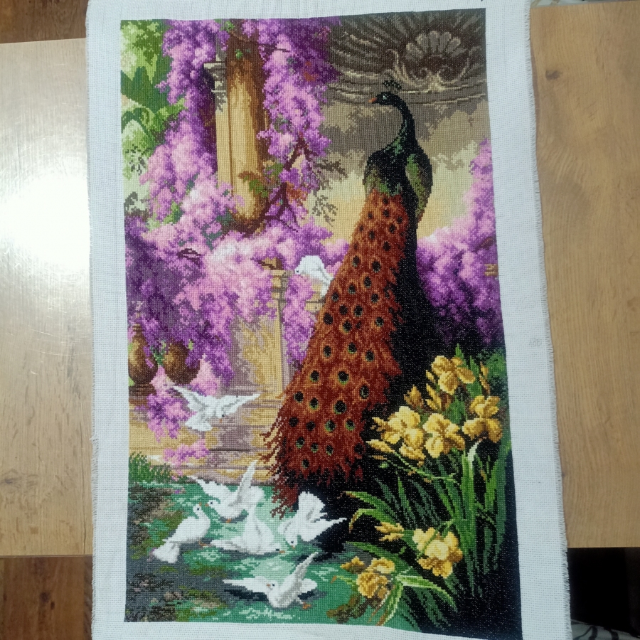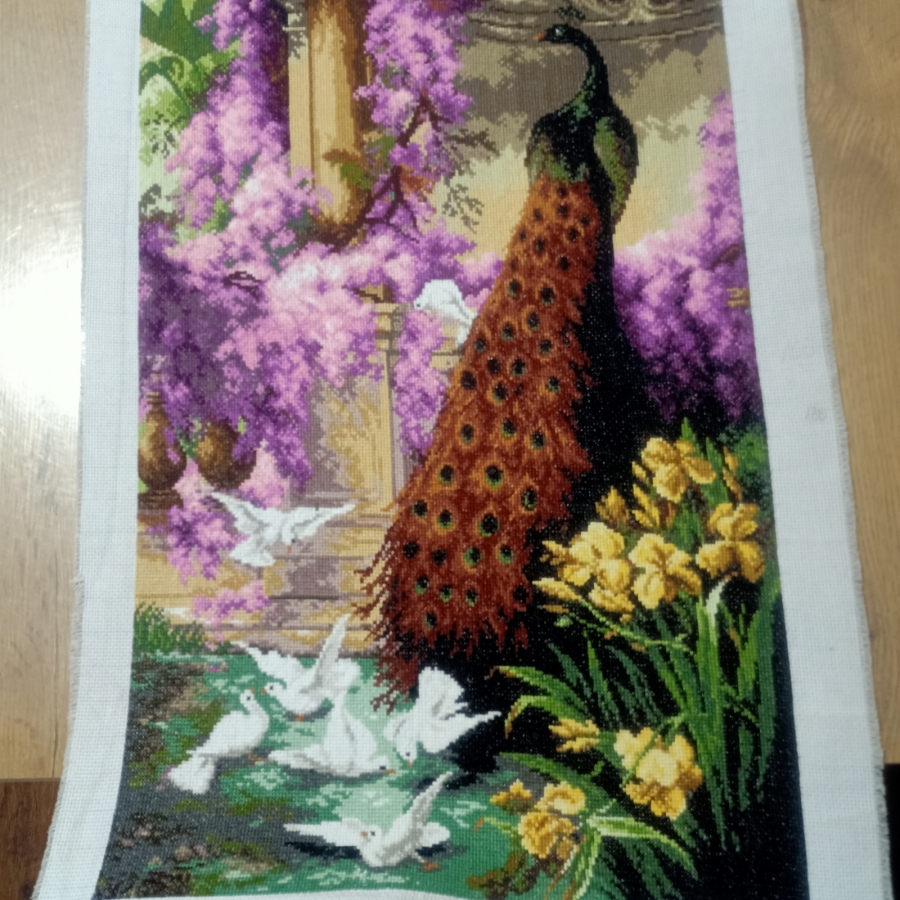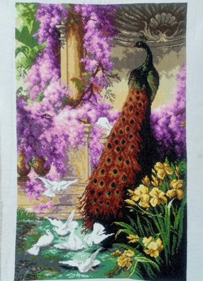 Rękodzieło artystyczne w postaci haftu krzyżykowego o tematyce elementów natury pt." Paw i gołebie w ogrodzie". Do wyszycia obrazu wykorzystano około 62000 krzyżyków na białej kanwie. Soczyste kolory, pięknie się prezentuje. Sprzedaż obrazu bez ramy.