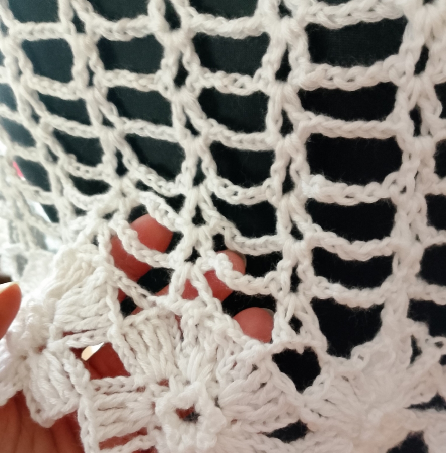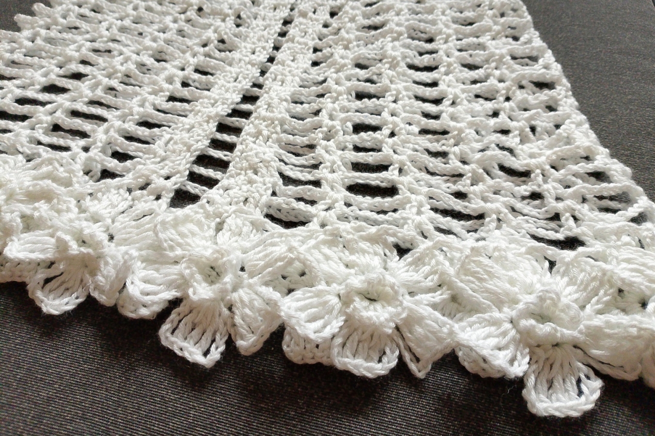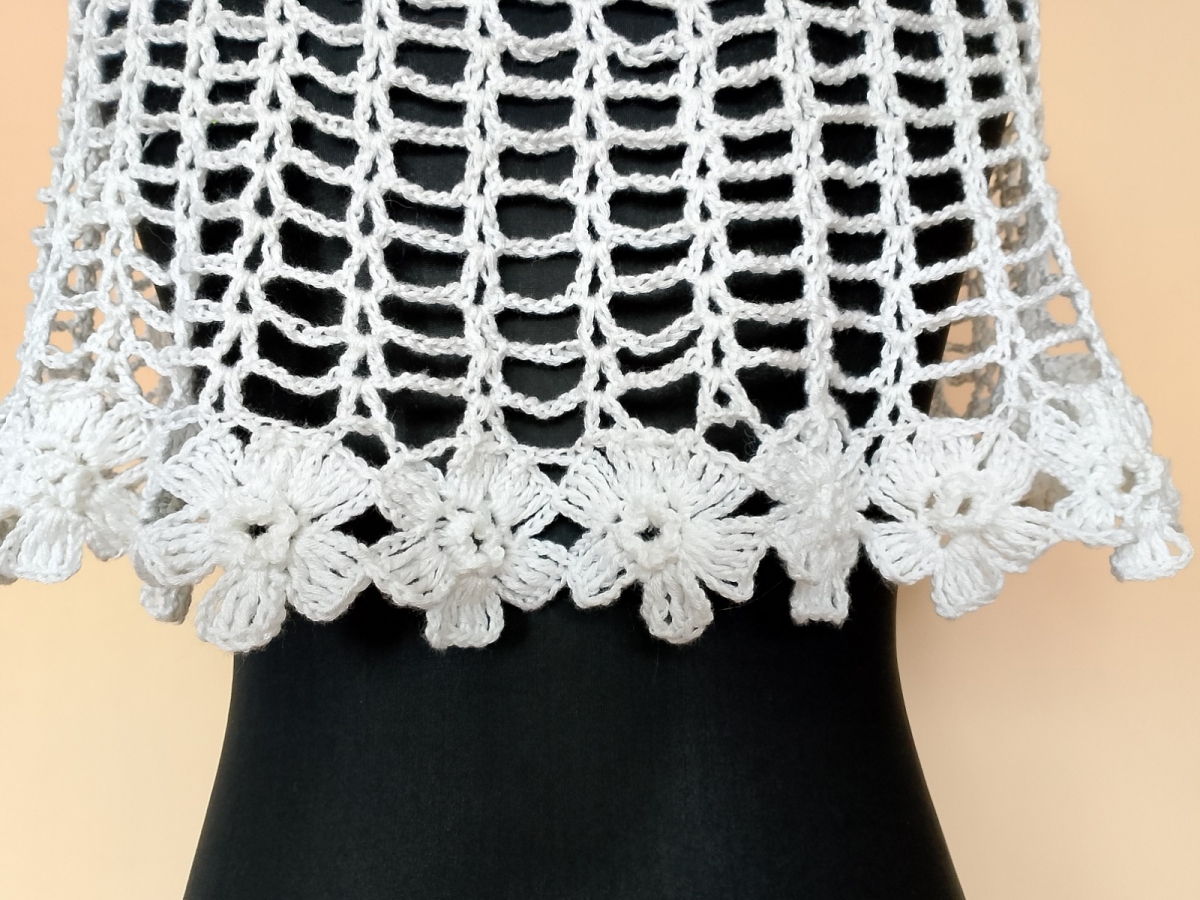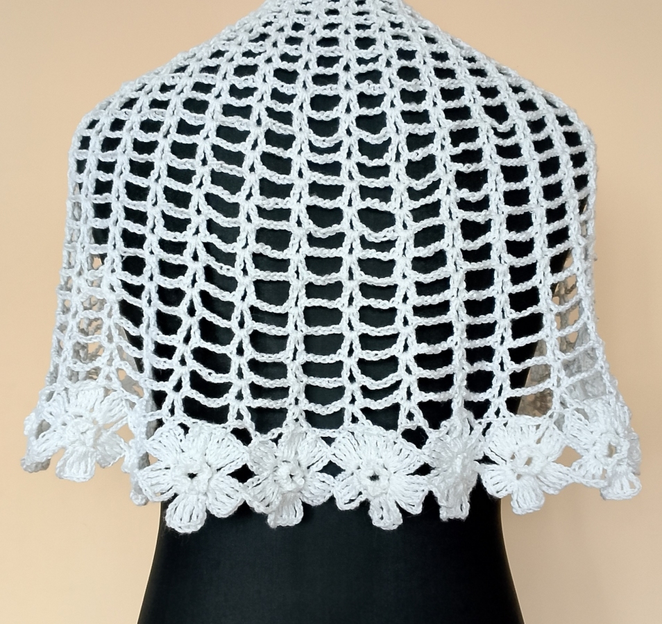 Śliczna komunijna pelerynka wykonana w całości ręcznie z wyjątkowej jakości włóczki, delikatnej w dotyku, o perłowym połysku, przelewającej się przez palce i jedwabiście gładkiej. Zakończona pięknymi szydełkowymi kwiatami. Wiązana wokół szyi sznureczkiem - wiązanie umożliwia regulację obwodu. Pasuje do każdego komunijnego stroju, zapewni ciepło i doda elegancji. Długość 38 cm, obwód dołu 105 cm. Rozmiar dziecięcy uniwersalny. Skład: jedwab 35 %, kaszmir 20 %, bambus 45 %. Gotowa do wysyłki.