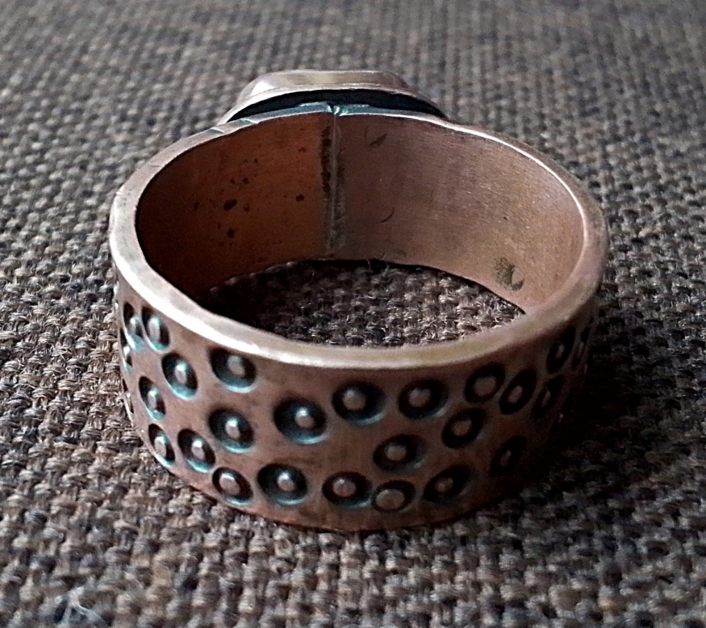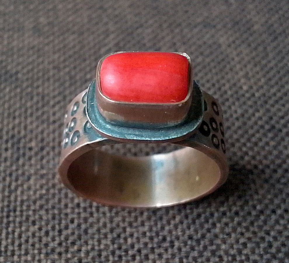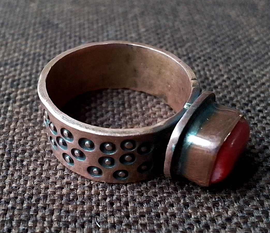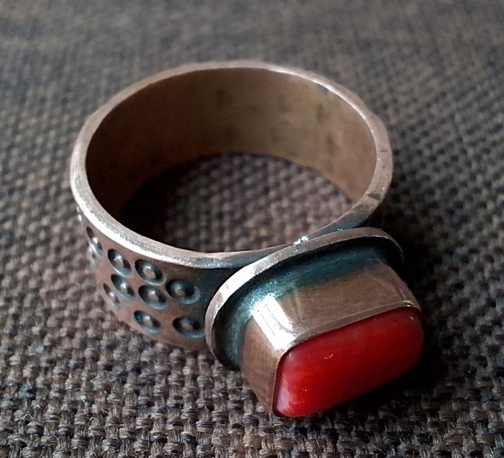 Pierścionek z miedzi z kamieniem koralowca. Pierścionek wykonany ręcznie. Koralowiec ok. 1/0.8 cm zakuty w cargę. Rozmiar pierścionka - 19. Szerokość szyny pierścionka - 0.9 cm. Masa - 6.7 grama. Tomasz.