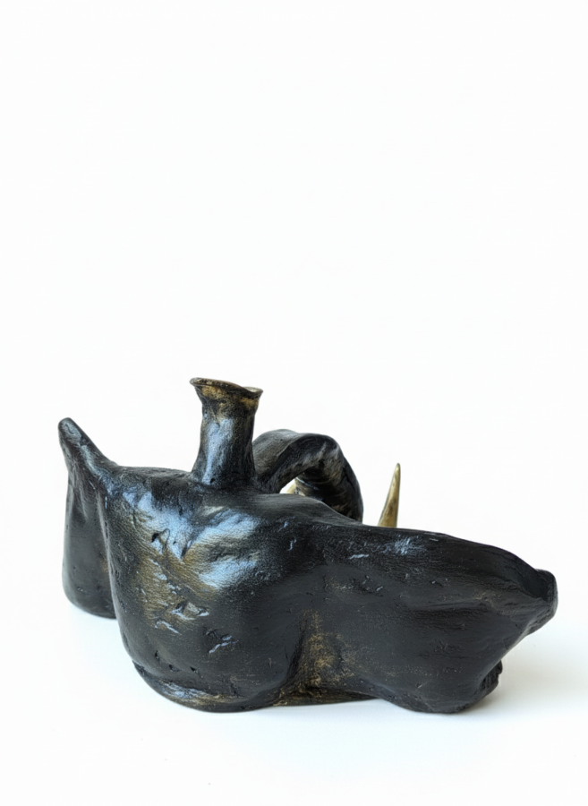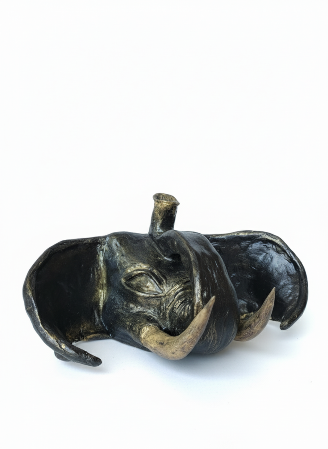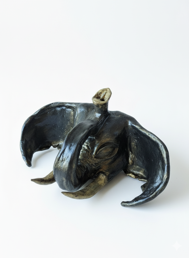 Unikalna, ręcznie wykonana figurka słonia z gliny, pomalowana akrylami i zabezpieczona lakierem. Może pełnić funkcję dekoracyjną lub być używana jako kadzidełko — dym efektownie wydobywa się przez trąbę słonia, a kadzidełko umieszcza się od spodu figurki.