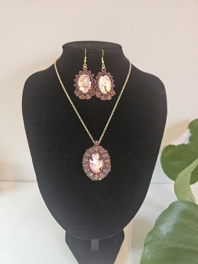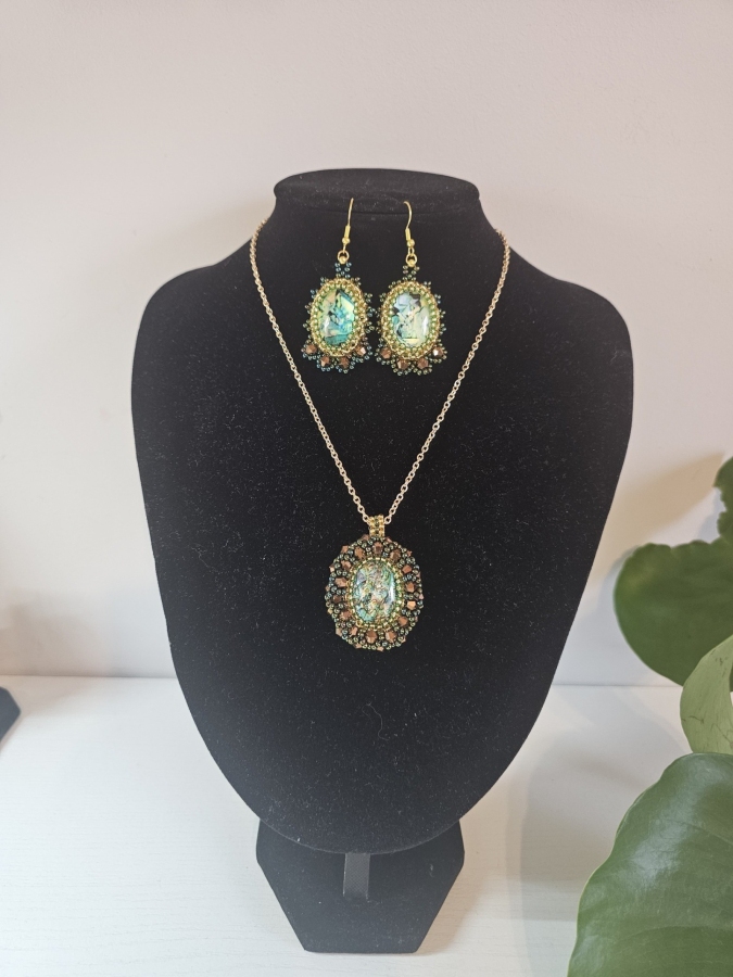 Elegancja zamknięta w detalu. Wyjątkowy komplet biżuterii, który przyciąga spojrzenia i dodaje blasku każdej stylizacji. Subtelne, złote wykończenie w połączeniu z ręcznie zdobionymi elementami tworzy niepowtarzalny efekt pełen klasy i kobiecości. Ręcznie wykonany naszyjnik i kolczyki Delikatne, romantyczne wzory Idealny na wyjątkowe okazje – wesela, kolacje, uroczystości Lekki, wygodny i pełen uroku To nie tylko biżuteria – to detal, który opowiada historię.