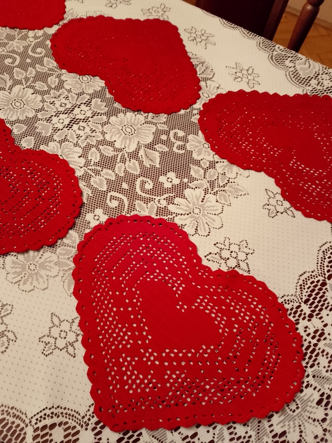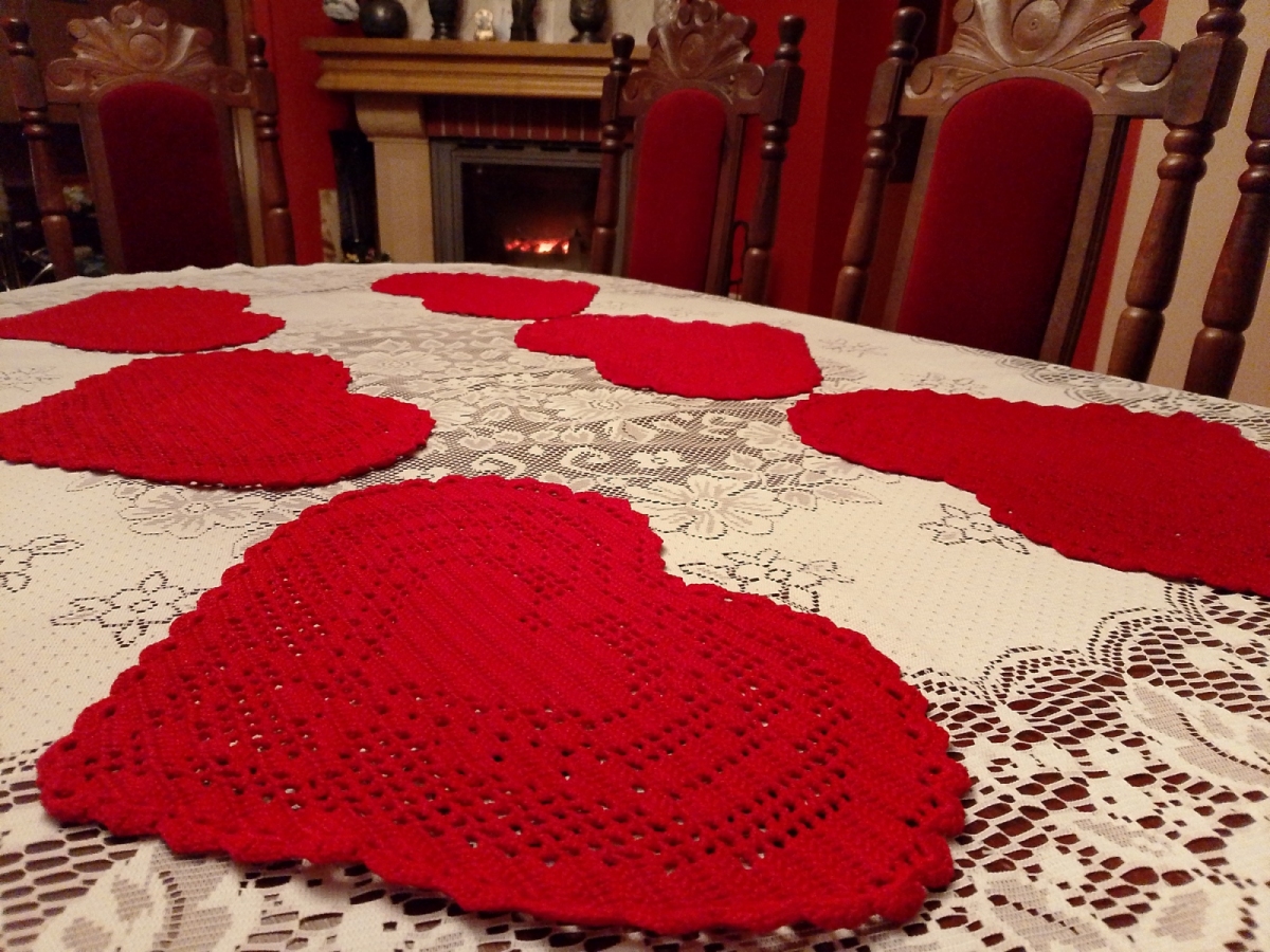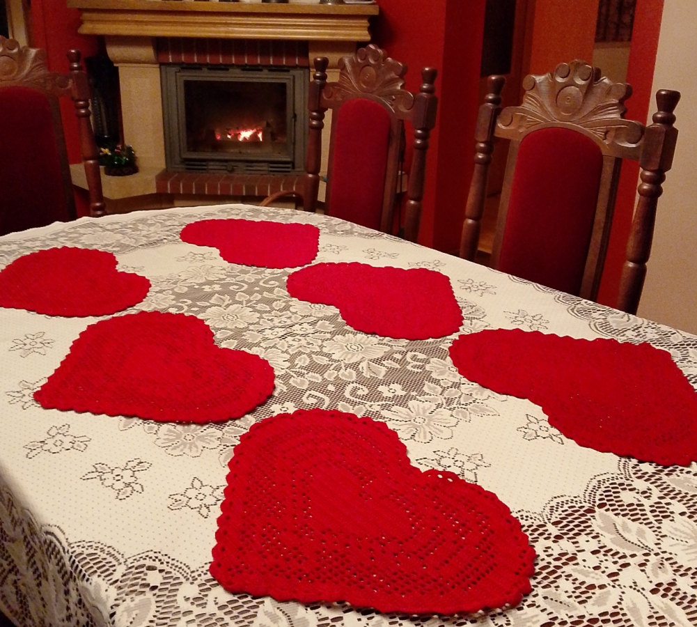 Wyjątkowy komplet serwetek w kształcie serca dla wyjątkowej osoby. Bez słów wypowie wszystkie słowa. Wymiary: 28 cm x 38 cm. Wykonane ręcznie z kordonka bawełnianego 100%, kolor czerwony. Komplet zawiera 4 szt serwetek oraz dodatkowo 2 serwetki gratis (które są w nieco innym odcieniu czerwieni, co jest mało zauważalne, jednak uczciwość nakazuje mi poinformowanie o tym fakcie i obniżenie ceny o te dwie serwetki właśnie) Gotowy do natychmiastowej wysyłki.