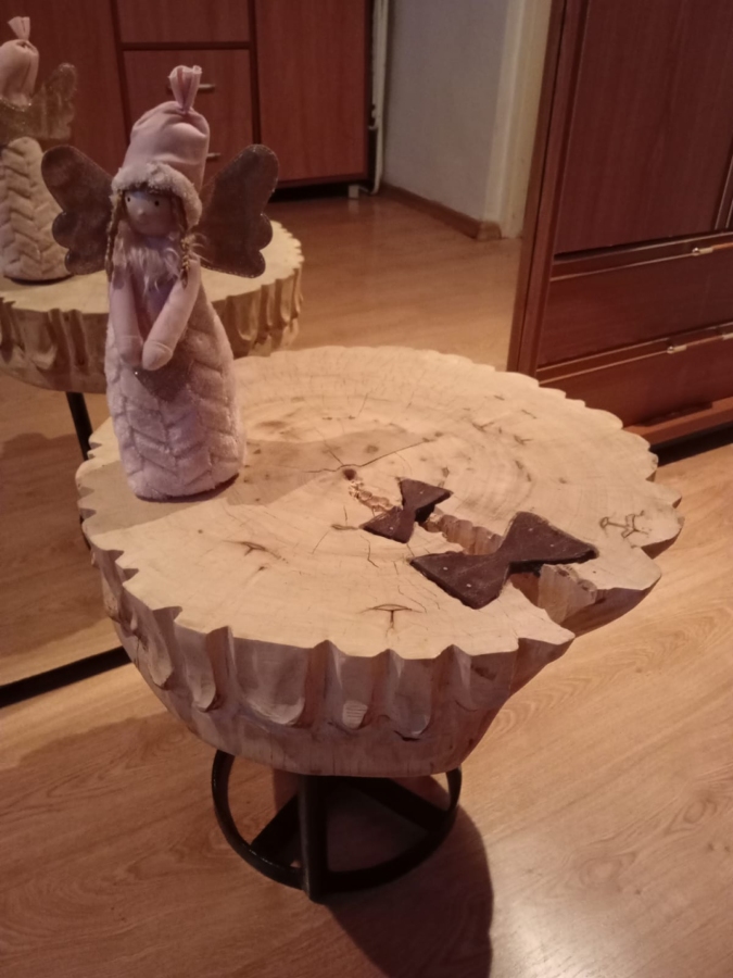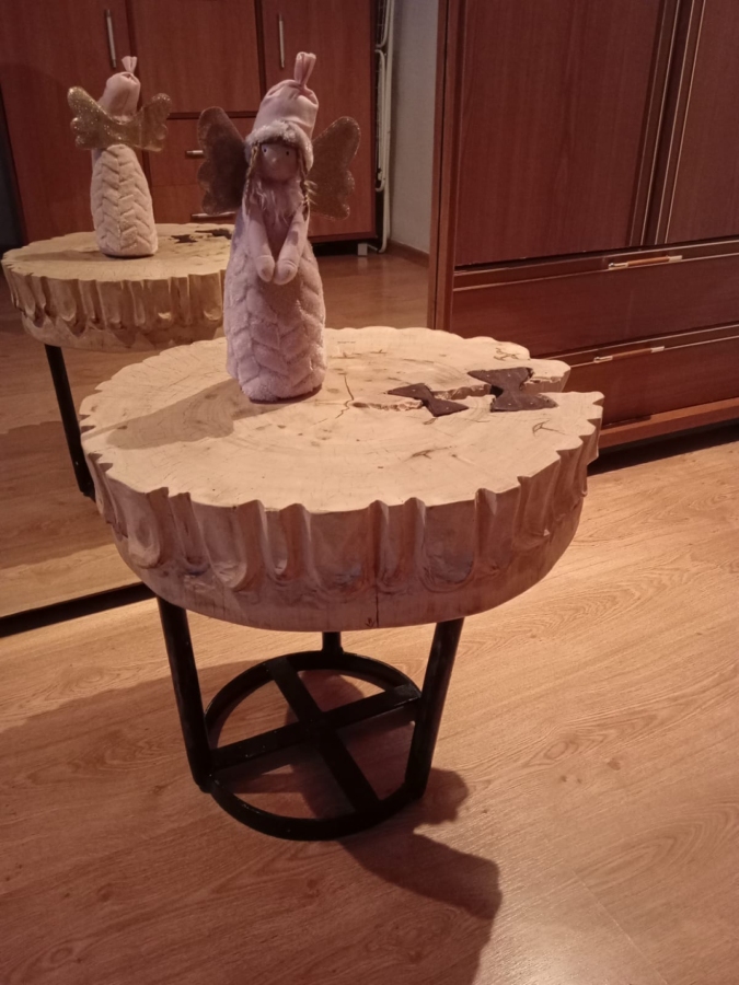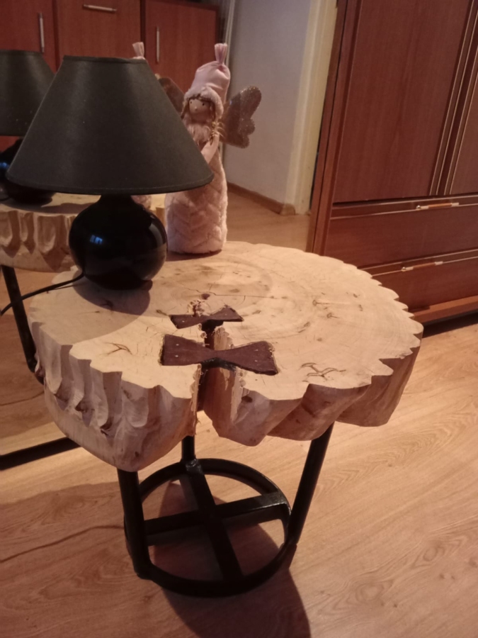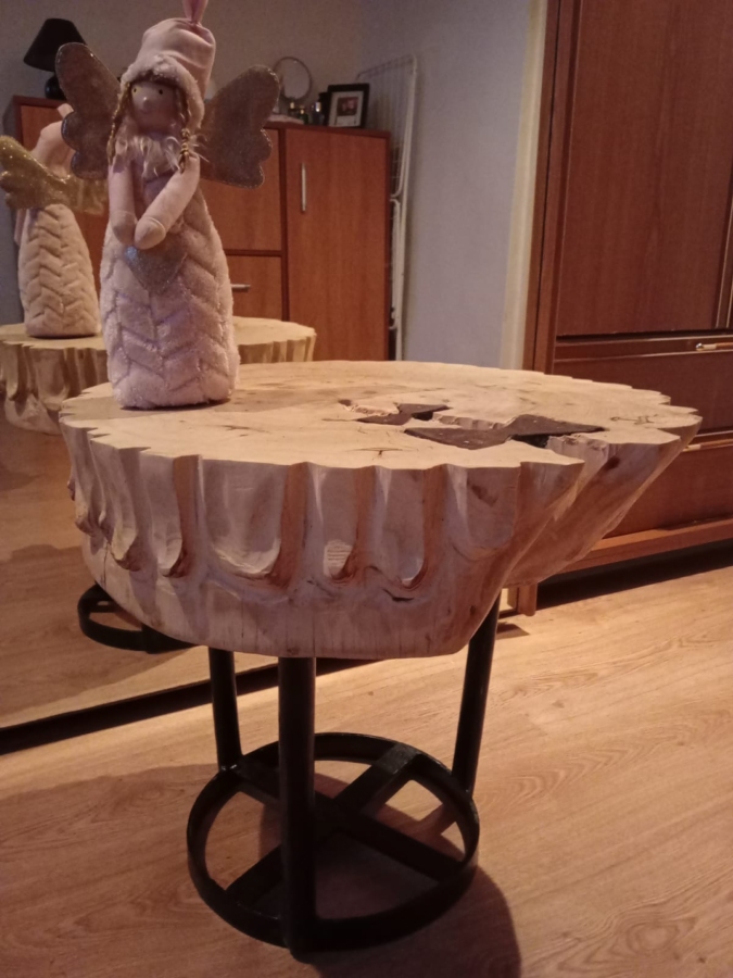 Stolik kawowy rzeźbiony z drzewa białego dębu nogi ze stali zaimpregnowany najlepszej jakość lakierem,pięknie wyposaży wnętrze każdego mieszkania czy biura.Unikatowy i niepowtarzalny jedyny w swoim rodzaju gorąco polecam.