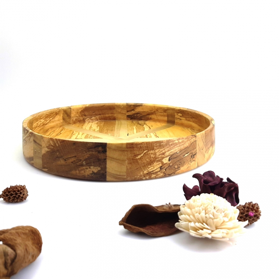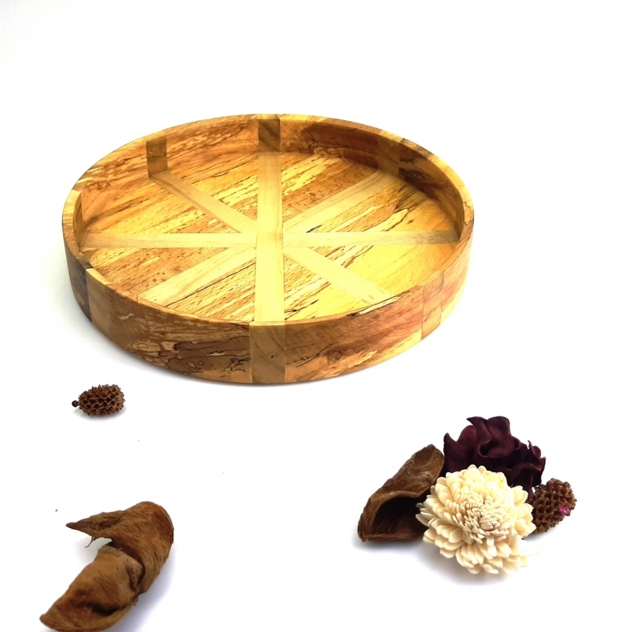 W pracowni Robie w drewnie udowadniamy, że drewno może być lekkie jak piórko. Przedstawiamy paterę, która jest kwintesencją delikatności – jej ścianki mają zaledwie 5 mm grubości, co nadaje jej niemal eteryczny charakter przy zachowaniu pełnej trwałości naturalnego surowca. Co czyni ją wyjątkową? Niezwykła lekkość: Dzięki precyzyjnemu toczeniu i ściankom o grubości 5 mm, patera jest wyjątkowo subtelna w odbiorze i delikatna w dotyku. Kunsztowne połączenie: Harmonijne zestawienie jasnego buku z ciepłą olchą tworzy promienisty, geometryczny wzór, który ożywia każde wnętrze. Minimalistyczna elegancja: Cienka krawędź sprawia, że patera wygląda niezwykle nowocześnie, stając się dyskretnym, ale luksusowym detalem na Twoim stole. Ręczna precyzja: Każdy element mozaiki został dopasowany z milimetrową dokładnością, by finalny produkt zachwycał płynnością linii i idealnym wykończeniem. Zastosowanie: To idealny wybór dla osób ceniących design minimalistyczny i eko-luksus. Patera doskonale wyeksponuje drobne owoce, orzechy lub po prostu będzie cieszyć oko jako unikatowy obiekt dekoracyjny.