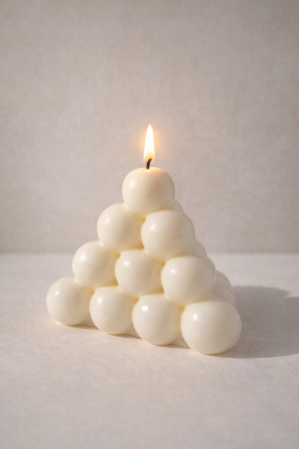 Świeca w kształcie trójkąta z bąbelkami, w kolorze kremowym. Świeca jest nowa i gotowa do użycia. Idealna jako dekoracja lub dodatek do domu. Zrobiona w 100% z naturalnego wosku sojowego i bawełnianego knota. Wymiary: - wysokość: 7 cm - szerokość: 8 cm - Waga: ok. 85g