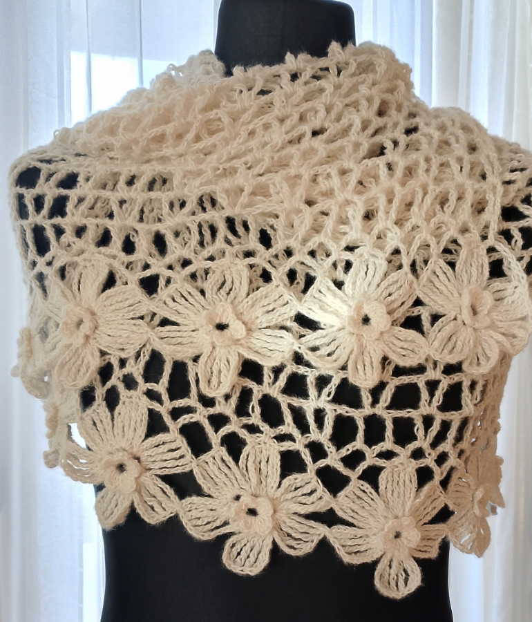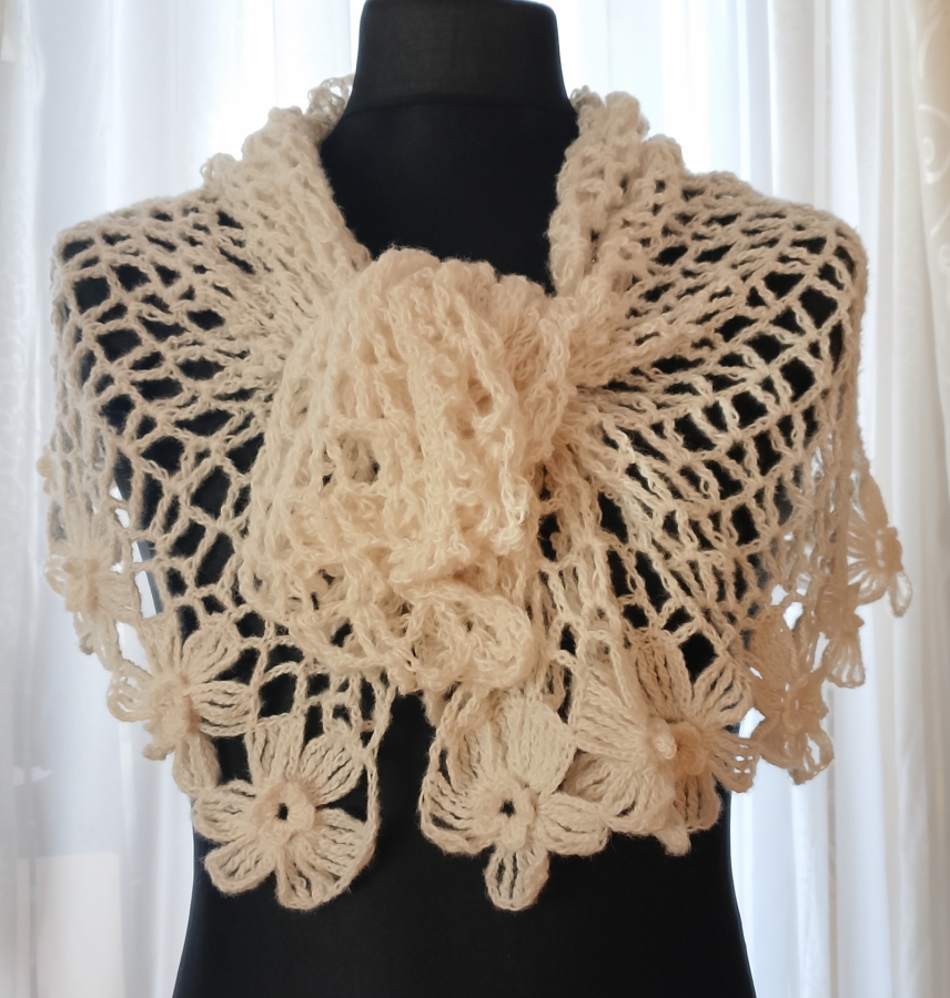 Wyjątkowo piękny szal wykonany w całości ręcznie. Użyto moheru, bardzo delikatnego w dotyku. Szal jest leciutki i ulotny jak mgiełka, a przy tym ciepły. Jest także plastyczny, dzięki czemu można kształtować go na wiele sposobów. Doda uroku każdej stylizacji, zarówno codziennej, jak i wieczorowej. Wymiary: 150 cm x 47 cm. Kolor ecru Autorski projekt i wykonanie. Powstał wyłącznie w jednym egzemplarzu. Gotowy do wysyłki.