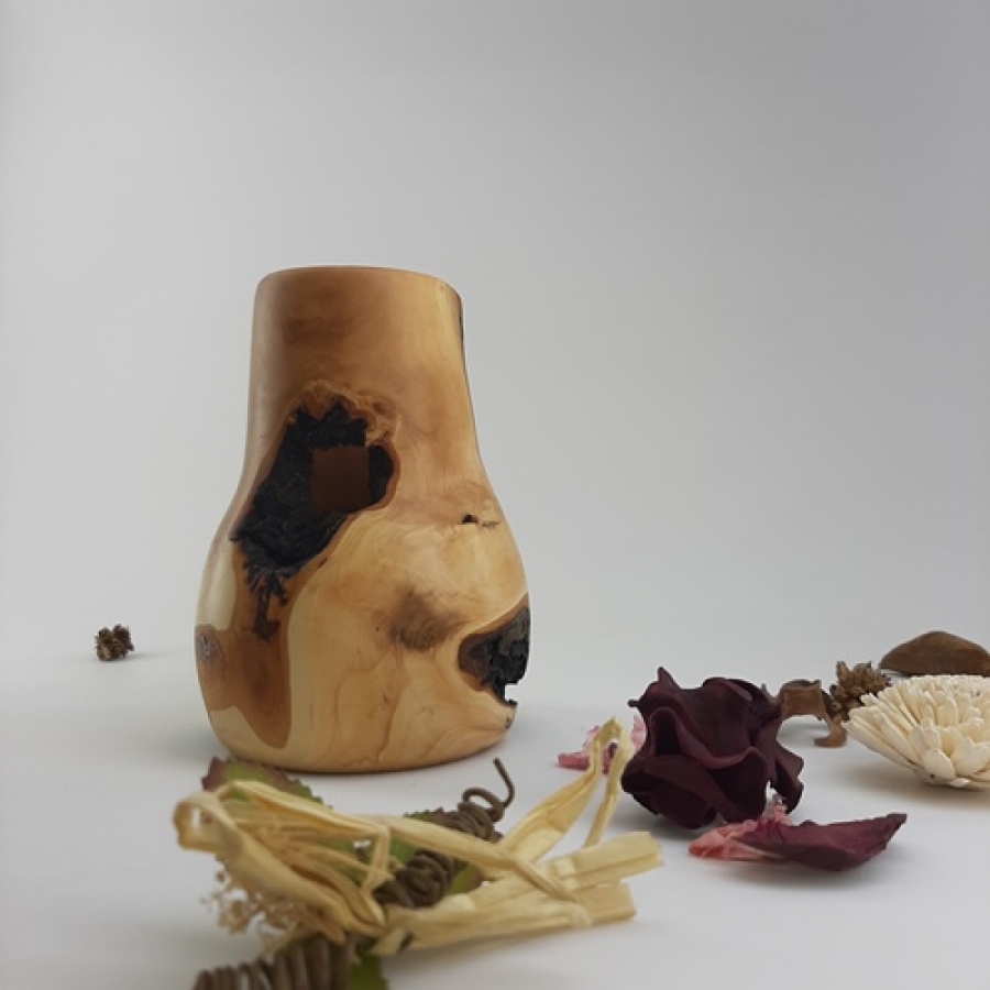 Mały wazon dekoracyjny z korzenia jabłoni to unikatowy element wystroju, który łączy naturalne piękno drewna z rzemieślniczą precyzją. Powstał z jednego kawałka korzenia, dzięki czemu zachował swój organiczny charakter, widoczny w naturalnych otworach, pęknięciach i nieregularnym układzie słojów. Każdy detal podkreśla indywidualność tego przedmiotu — nie ma dwóch identycznych egzemplarzy. ???? Charakter i wykonanie Wazon został w pełni wykonany ręcznie, co nadaje mu wyjątkowy, artystyczny charakter. Gładka powierzchnia i naturalne przebarwienia drewna tworzą harmonijną kompozycję, idealną do wnętrz inspirowanych naturą, stylem rustykalnym, boho czy minimalistycznym. Do impregnacji użyto oleju z dodatkiem wosku, posiadającego certyfikat EN71-3. Oznacza to, że produkt jest bezpieczny w kontakcie z żywnością oraz może być stosowany na przedmiotach przeznaczonych dla dzieci. ???? Wymiary Szerokość: 10 / 6 cm Wysokość: 14 cm Głębokość: 12 cm Średnica otworu: 5 cm ???? Zastosowanie Wazon świetnie sprawdzi się jako dekoracja półki, komody czy stołu. Może pełnić funkcję samodzielnej ozdoby lub stanowić oprawę dla suchych kompozycji roślinnych. Jego naturalny wygląd wprowadza do wnętrza ciepło i subtelną elegancję