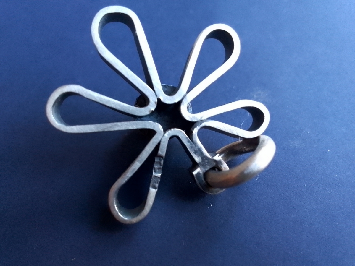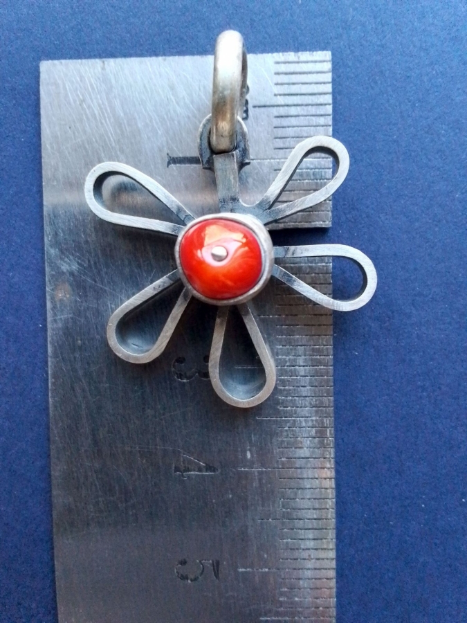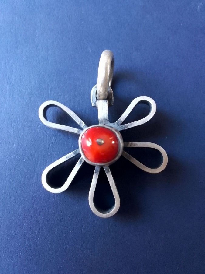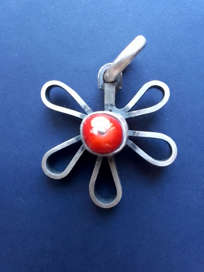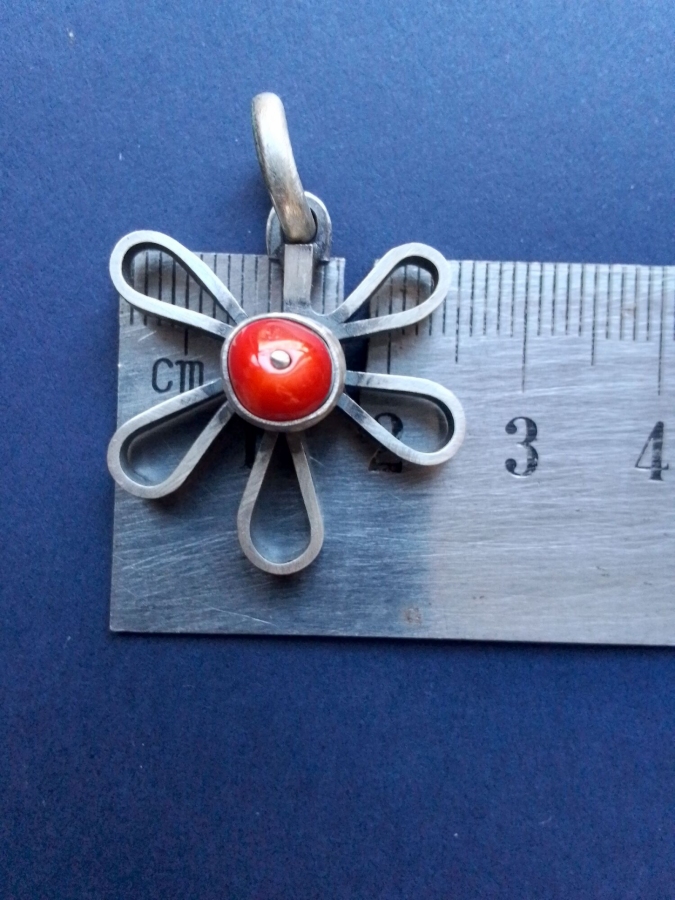 Wisiorek wykonany ze srebra próby 0,925, z oczkiem z koralowca. Wyrób ocechowany urzędowo, oraz z imiennikiem twórcy. Wisiorek wykonany ręcznie, w niepowtarzalnym egzemplarzu. Powierzchnia lekko matowana, ale błyszcząca, oksydowany częściowo. Koralowiec o średnicy ok. 8 mm, zakuty w cargę. Długość wisiorka to ok. 3.5 cm, szerokość to ok. 2.5 cm. Masa to 6.7 grama. Dziękuję, Tomasz.