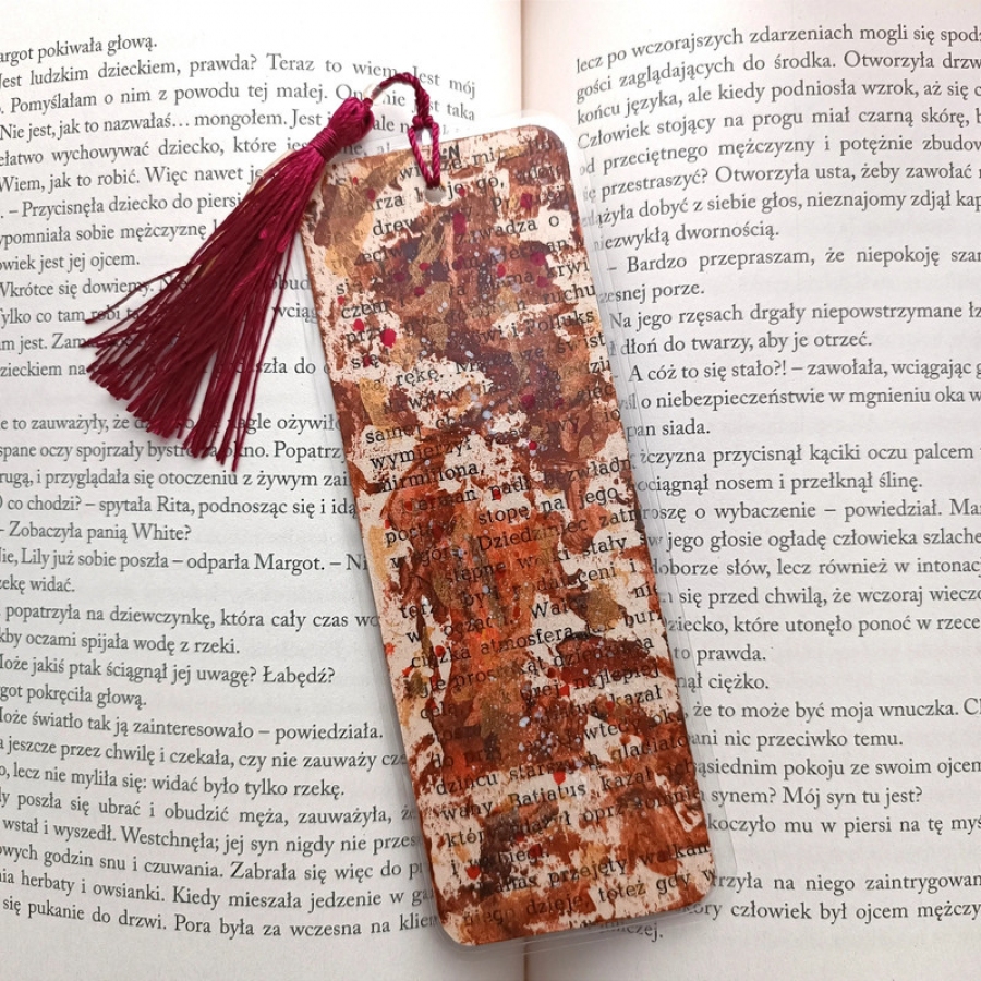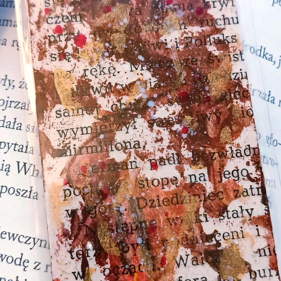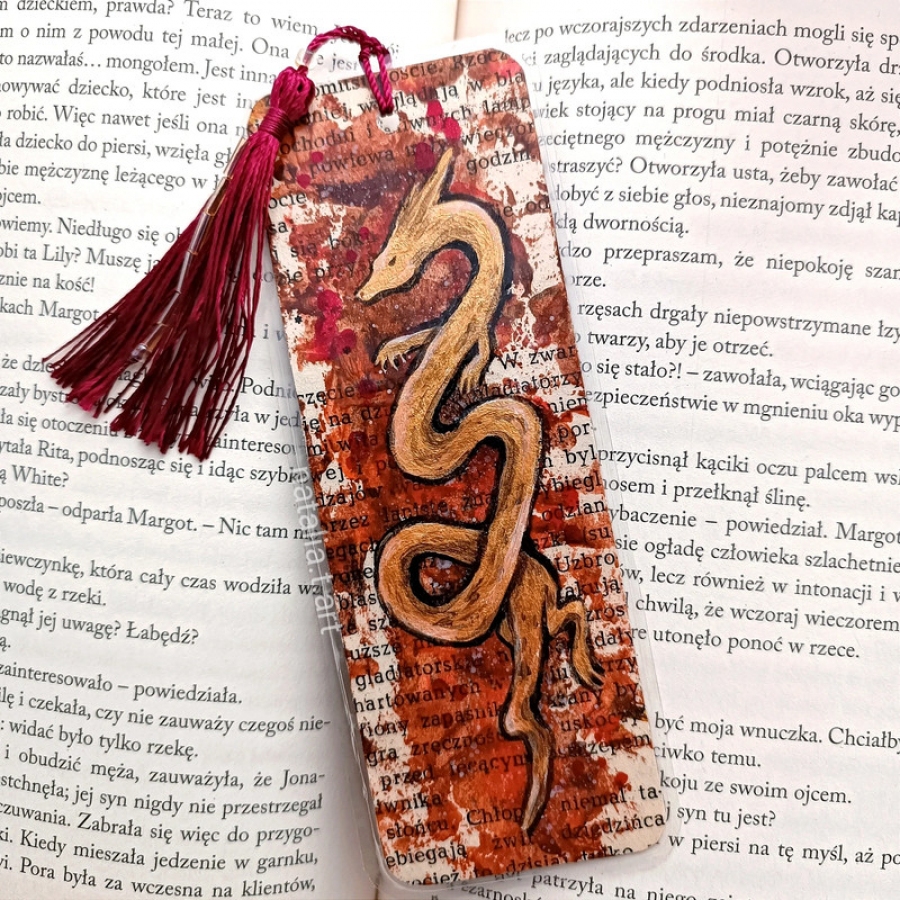 Własnoręcznie malowana zakładka do książki w unikatowym wzorze. Laminowana Dwustronna Wymiary 14cm x 5cm Wykonana z grubego kartonu Z ozdobnym frędzelkiem Posiada błyszczące elementy