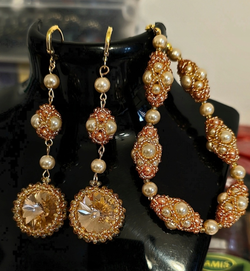 Ręcznie robiony zestaw biżuteri składający się z branzoletki i kolczyków. Biżuteria jest w kolorze różowego złota ozdobiona elementami perły. Głównymi elemantami dekoracyjnymi są okrągłe, perłowe koraliki w połączeniu z owalnymi , filigramowymi ogniwami, które wysadzane są drobnymi, jasnymi kamoieniami, dającymi efekt iskrzenia.