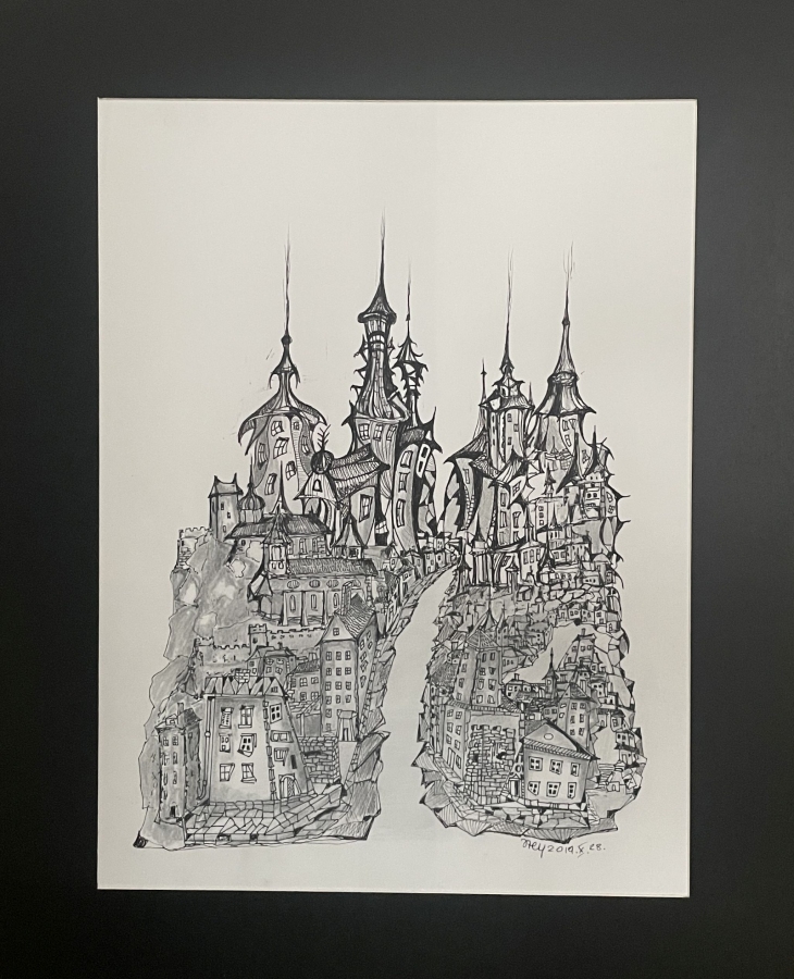 „Stare miasto” to autorska grafika przedstawiająca fantazyjną zabudowę o baśniowym charakterze. Dolne partie kompozycji są realistyczne, pełne szczegółowych kamienic i brukowanych uliczek, natomiast górne wieże przybierają nieregularne, wykrzywione formy, tworząc wrażenie miasta z pogranicza snu i rzeczywistości. Delikatne operowanie cienką kreską i bogactwo detalu przywodzą na myśl architektoniczne szkice, które przenikają się z wyobraźnią artysty. To praca, która łączy w sobie precyzję rysunku z poetycką wizją.