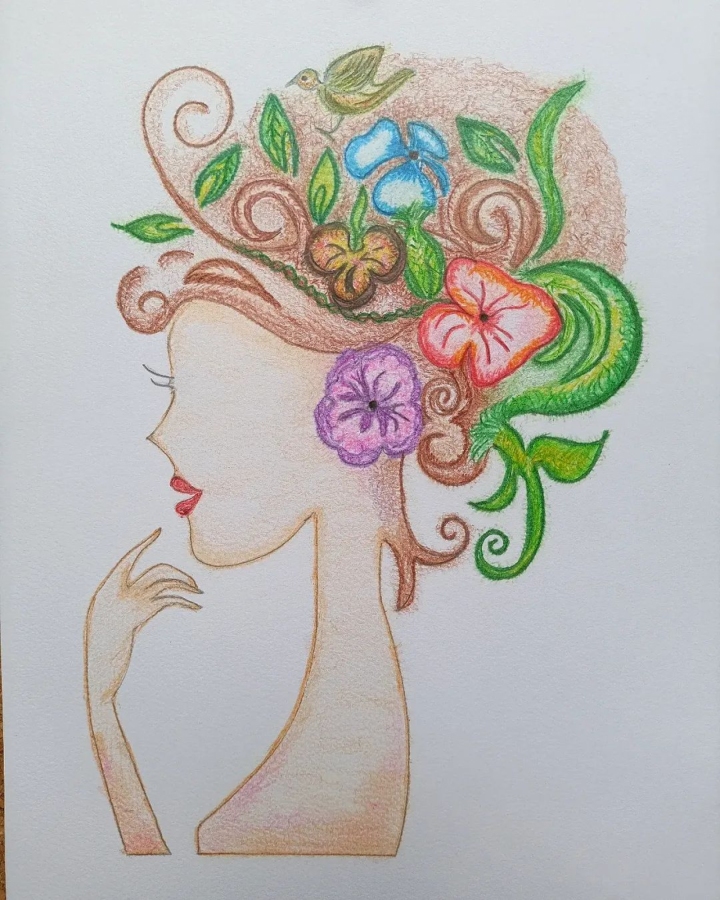Obraz został namalowany kredkami co nadaje pracy miękkość i subtelność. Kolory są żywe, pełne harmonii i ciepła. Przedstawia twarz kobiety ukazaną z profilu. W jej włosy wplecione są barwne kwiaty, zielone liście i mały ptaszek. Kompozycja symbolizuje więź człowieka z naturą, delikatność kobiecości oraz piękno ukryte w prostocie. Włosy kobiety stają się częścią przyrody – jakby wiatr i kwiaty spleciono w jedno. Obraz przeznaczony dla osób, które kochają więź z naturą, poszukują spokoju i ciszy.
