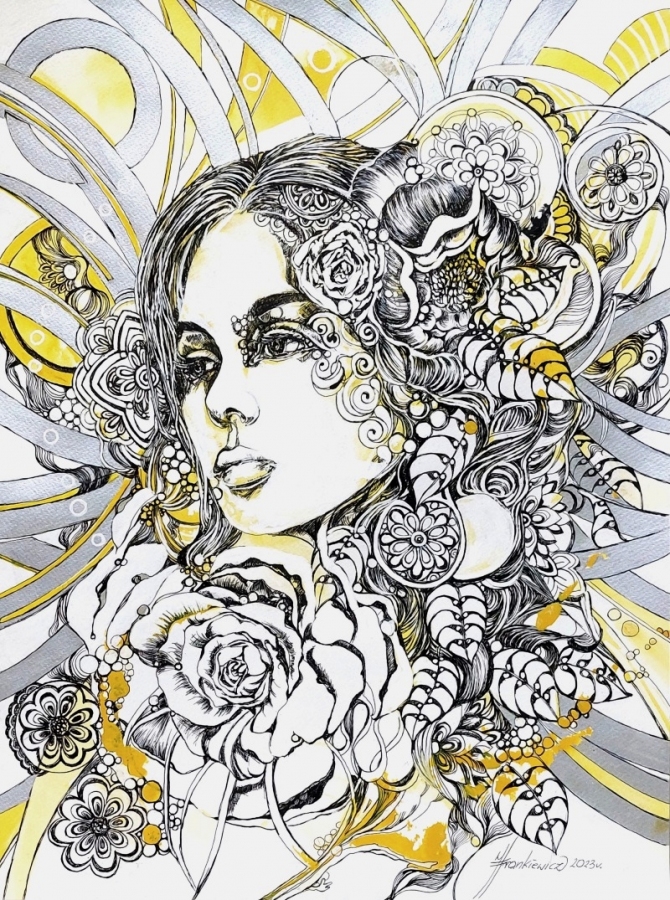 Grafika malowana na białym papierze o gramaturze 300g/m2 w technice : piórko , tusz , akwarela . Obraz z cyklu ,, Grafik bez tytułu ,, poz.10 Format obrazu 42x56 cm. Tusze koloru czarnego, srebra , bieli , żółty. Sygnatury umieszczone z przodu i z tyłu obrazu. ------------Art by Jolanta Frankiewicz-----------
