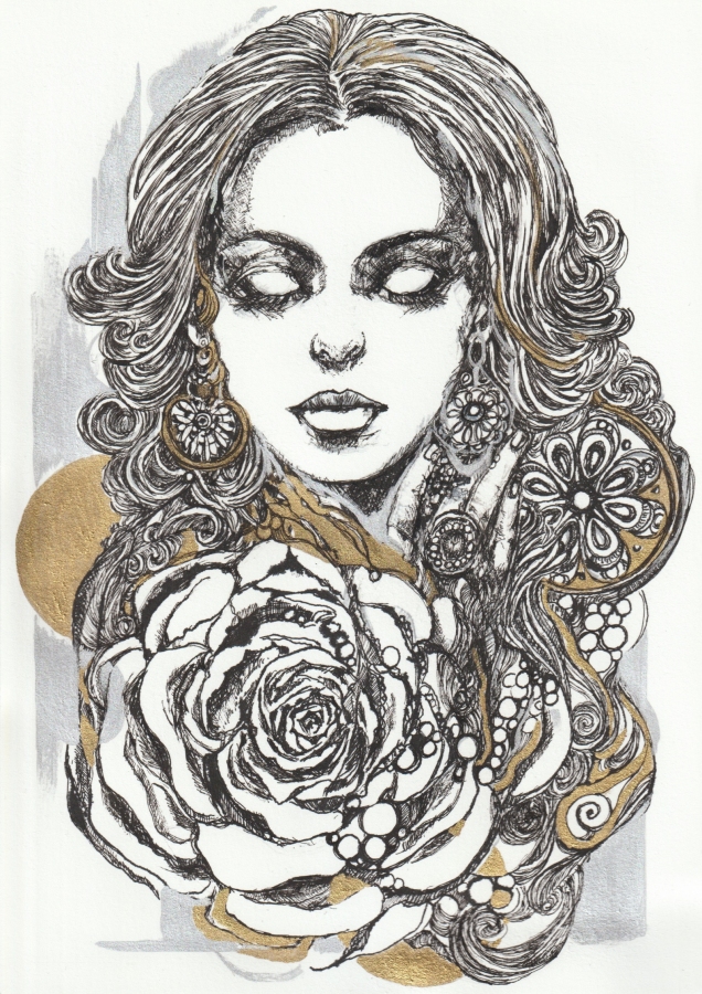 ,, Zwierciadło ,, - artystyczny rysunek , wykonany tradycyjną techniką tuszu na profesjonalnym , białym papierze artystycznym .. Rysunek w stylu minimalistycznym . Abstrakcyjny portret kobiety , otoczonej ,,woalem,, z fantazji i marzeń . Wysoka jakość zastosowanych podczas tworzenia materiałów artystycznych , oraz naturalna kolorystyka podbijają walory artystyczne pracy. Tusze artystyczne koloru czarnego, złota i srebra . Format rysunku 21x29,7 cm ./A4/ Zabezpieczony werniksem. Praca oryginalna , jedyny egzemplarz opatrzony Autorskim Certyfikatem Autentyczności. Sygnatury autorskie umieszczone z tyłu pracy. ,,,,,,,,,,,,,,,,,,,,,,,,,, Art by Jolanta Frankiewicz ,,,,,,,,,,,,,,,,,,,,,,,,,,,,,