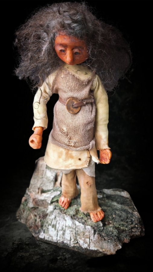 Hardal 01 – Z popiołów Unikalna rzeźba łącząca glinę i tkaninę. Całkowita wysokość: 29 cm (figura 26 cm). Głowa, dłonie i stopy zostały ręcznie wyrzeźbione i pomalowane. Konstrukcja oparta jest na wewnętrznym szkielecie, który pozwala na subtelne dostosowanie gestów i postawy. Figura jest trwale przymocowana do naturalnej podstawy z kory drzewa.a Naturalne tkaniny, zszyte i pokryte patyną, tworzą fakturę i ślady upływającego czasu. Hardal to figura przetrwania. Najmniejsza – uważana za zbyt delikatną, by przetrwać. Chwila po wszystkim. Cisza po pożarze.