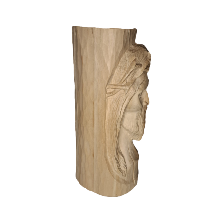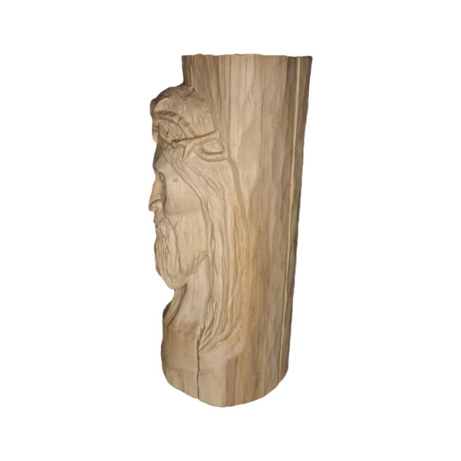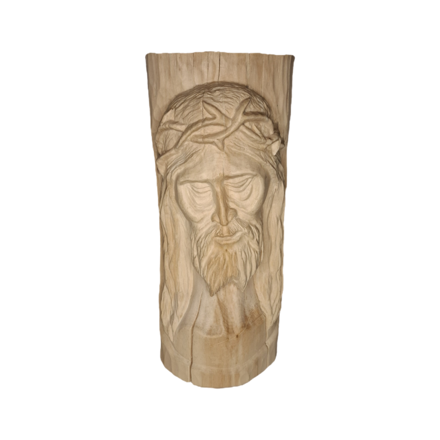 Rzeźba wykonana ręcznie w drewnie lipowym, przedstawiająca twarz Jezusa Chrystusa w koronie cierniowej. Dzieło wyróżnia się głębokim wyrazem emocjonalnym oraz precyzją detalu – od subtelnie wyrzeźbionych włosów i brody, po dramatyczne napięcie w rysach twarzy. Naturalna faktura drewna została podkreślona delikatnym wykończeniem woskiem, co nadaje całości ciepły, organiczny charakter. Forma osadzona jest w cylindrycznym kawałku drewna, co nadaje kompozycji monumentalny, niemal sakralny wymiar. Rzeźba idealnie sprawdzi się jako element kolekcji sztuki sakralnej, dekoracja wnętrza o duchowym charakterze, lub wyjątkowy prezent dla konesera rzemiosła artystycznego.