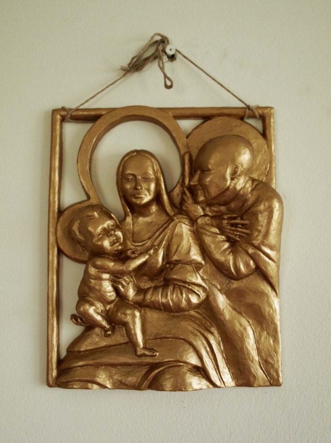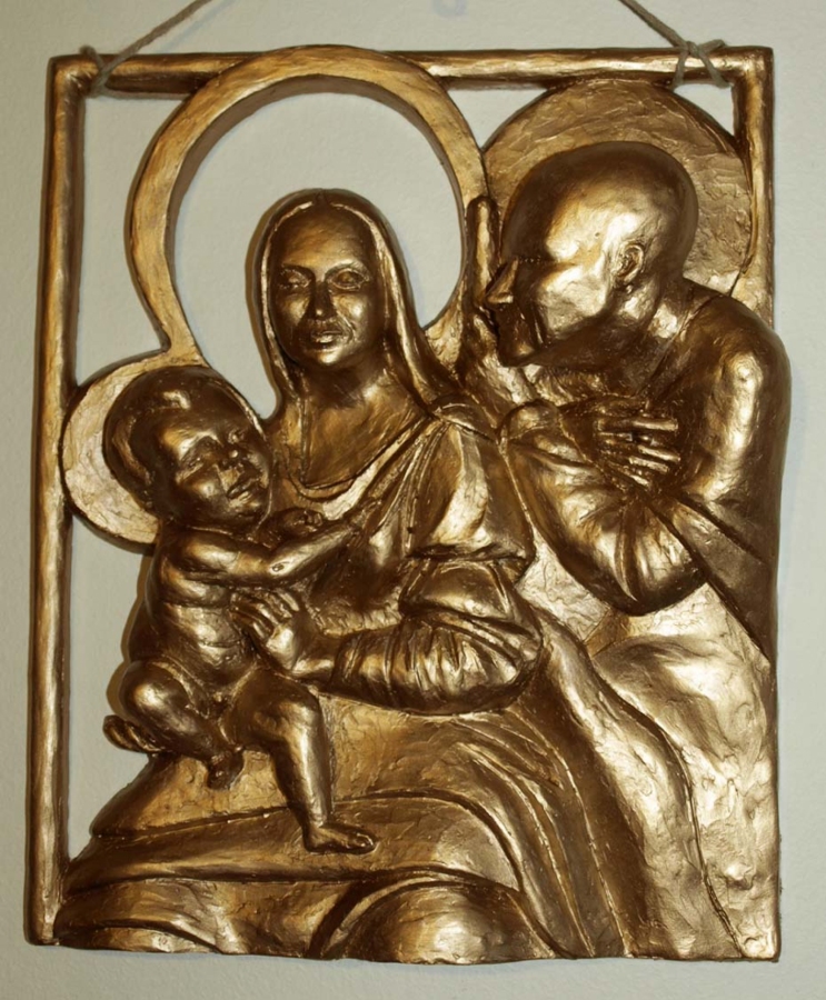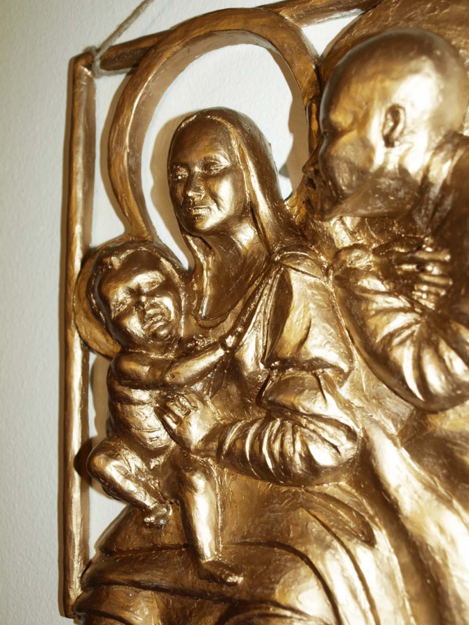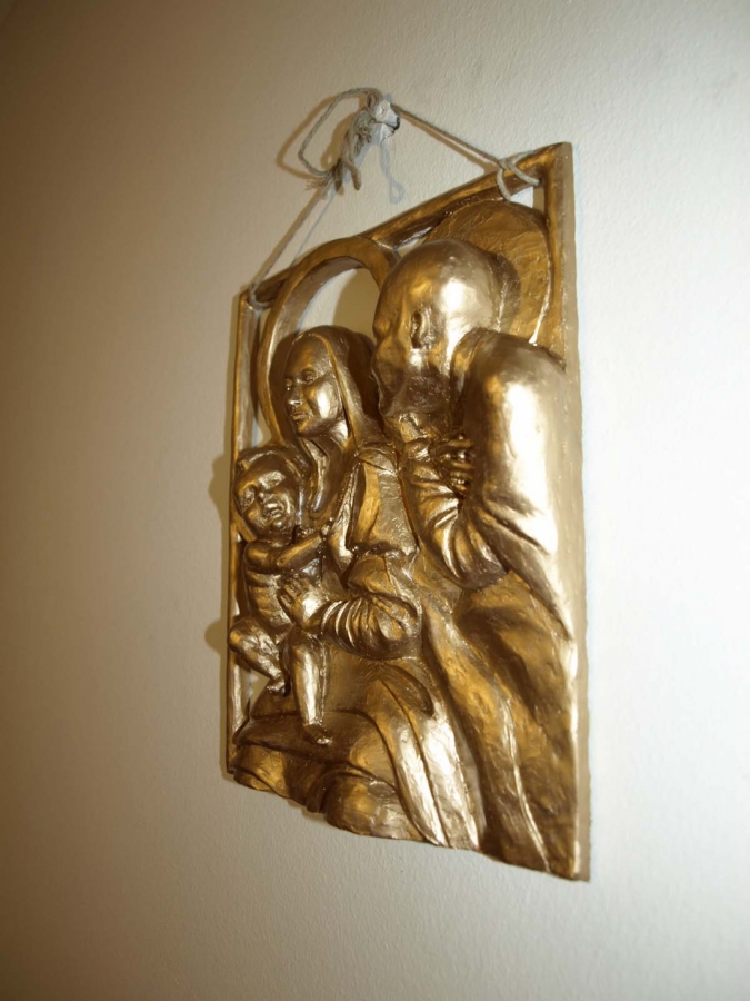 Płaskorzeźba przedstawia Święta Rodzinę, a kompozycja jest inspirowana ryciną Leonarda da Vinci. Odlew wykonany z gipsu polimerowego czyli kombinacji gipsu i żywicy, dużo trwalszego materiału, odpornego na wilgoć i uderzenia. Pokryta lakierem z dodatkiem złotego pyłku dedykowana do wykończenia prac wykonanych z gipsu polimerowego.